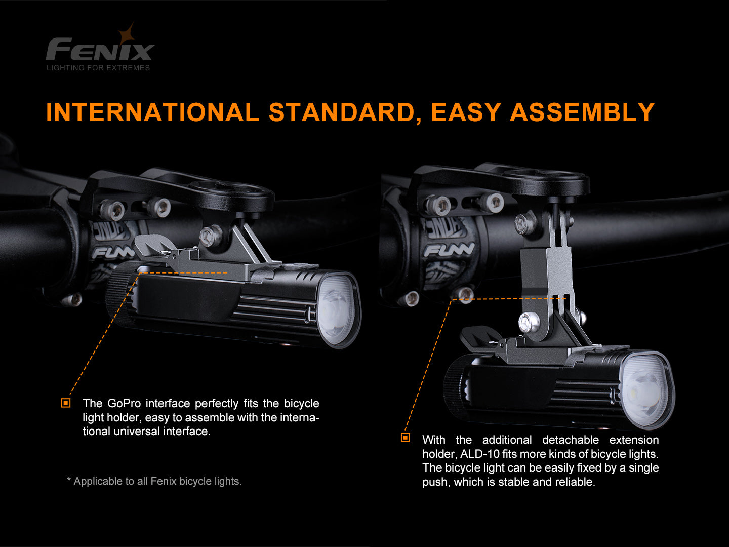 Mit dem zusätzlichen, abnehmbaren Verlängerungsadapter ist der ALD-10 mit noch mehr Lampenmodellen kompatibel – ideal für alle, die ihre Beleuchtung flexibel anpassen möchten. Die Lampe lässt sich mit nur einem Klick sicher fixieren, stabil und zuverlässig, selbst auf holprigen Strecken.