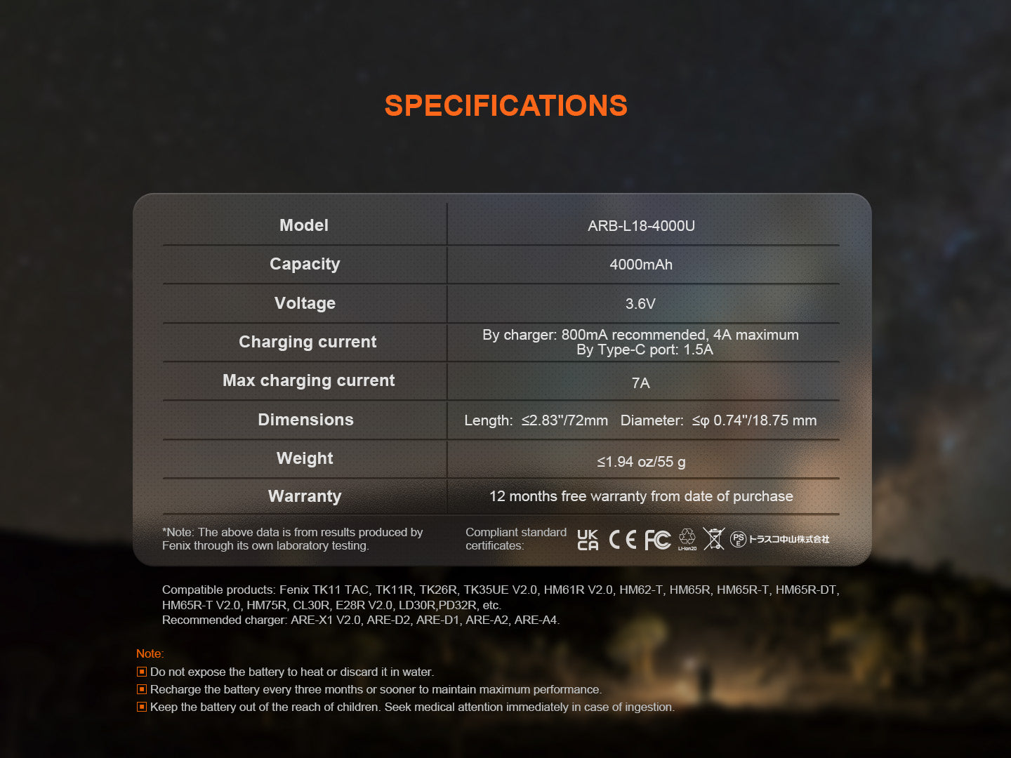 Die Fenix ARB-L18-4000U ist eine leistungsstarke, wiederaufladbare 18650-Li-Ion-Akkuzelle mit integriertem USB C Ladeanschluss. Mit ihrem hohen 4000 mAh Energieinhalt liefert sie verlässliche Performance. Er wurde speziell für den Einsatz in leistungsstarken Fenix-Taschenlampen entwickelt und bietet maximale Sicherheit durch eine dreifache Schutzschaltung. Ideal für anspruchsvolle Anwendungen – von taktischen Einsätzen bis hin zu Outdoor-Abenteuern.